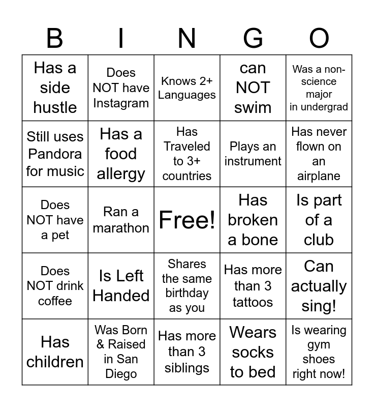 This bingo card has a free space and 24 words: Is Left Handed, Was Born & Raised in San Diego, Has Traveled to 3+ countries, Has children, Was a non-science major in undergrad, Has a side hustle, Still uses Pandora for music, Does NOT have Instagram, Has broken a bone, Shares the same birthday as you, Plays an instrument, Does NOT have a pet, Has more than 3 tattoos, Can actually sing!, Has a food allergy, Wears socks to bed, Is part of a club, Knows 2+ Languages, Has never flown on an airplane, Ran a marathon, Is wearing gym shoes right now!, Does NOT drink coffee, can NOT swim and Has more than 3 siblings.