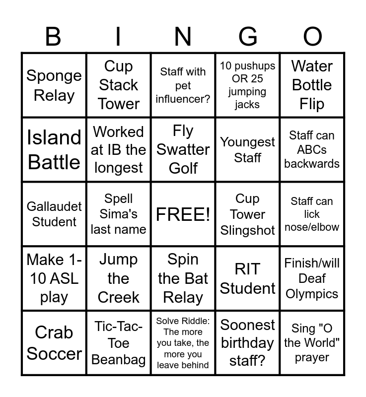 This bingo card has a free space and 24 words: Jump the Creek, Tic-Tac-Toe Beanbag, Fly Swatter Golf, Crab Soccer, Water Bottle Flip, Sponge Relay, Island Battle, Cup Stack Tower, Cup Tower Slingshot, Spin the Bat Relay, Youngest Staff, Gallaudet Student, RIT Student, Finish/will Deaf Olympics, Worked at IB the longest, Soonest birthday staff?, Staff can lick nose/elbow, Staff with pet influencer?, Staff can ABCs backwards, Spell Sima's last name, Sing "O the World" prayer, Make 1-10 ASL play, 10 pushups OR 25 jumping jacks and Solve Riddle: The more you take, the more you leave behind.