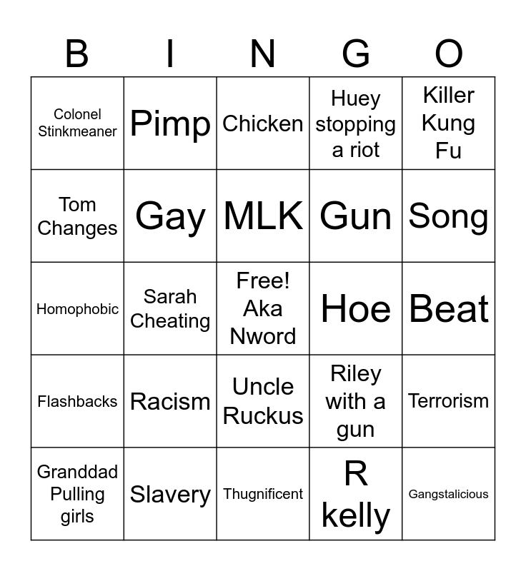 This bingo card has a free space and 24 words: Racism, Slavery, MLK, Granddad Pulling girls, Killer Kung Fu, Colonel Stinkmeaner, Tom Changes, Pimp, Hoe, Uncle Ruckus, Gun, Homophobic, Riley with a gun, Terrorism, Gay, R kelly, Beat, Chicken, Song, Sarah Cheating, Gangstalicious, Flashbacks, Huey stopping a riot and Thugnificent.