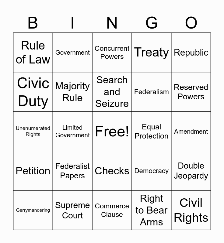 This bingo card has a free space and 100 words: Preamble, Article, Amendment, Bill of Rights, Ratify, Legislative, Executive, Judicial, Congress, Senate, House of Representatives, President, Vice President, Supreme Court, Checks and Balances, Separation of Powers, Federalism, Veto, Override, Impeachment, Electoral College, Constitution, Liberty, Justice, Due Process, Equal Protection, Republic, Democracy, Natural Rights, Popular Sovereignty, Limited Government, Rule of Law, Freedom of Speech, Freedom of Religion, Right to Bear Arms, Search and Seizure, Double Jeopardy, Self-Incrimination, Speedy Trial, Jury Trial, Bail, Cruel and Unusual Punishment, Unenumerated Rights, States’ Rights, Reserved Powers, Concurrent Powers, Enumerated Powers, Implied Powers, Necessary and Proper Clause, Commerce Clause, Supremacy Clause, Full Faith and Credit, Ex Post Facto, Habeas Corpus, Naturalization, Treason, Oath of Office, Commander in Chief, Cabinet, Treaty, State of the Union, Appointment, Judicial Review, Original Jurisdiction, Appellate Jurisdiction, Majority Opinion, Dissenting Opinion, Constitutional Convention, Founding Fathers, James Madison, Alexander Hamilton, Federalist Papers, Anti-Federalists, Compromise, Three-Fifths Compromise, Great Compromise, Elastic Clause, Civic Duty, Civic Virtue, Suffrage, Poll Tax, Civil Rights, Civil Liberties, Checks, Balance, Government, Law, Citizen, Framers, Petition, Assembly, Census, Redistricting, Gerrymandering, Majority Rule, Minority Rights, Initiative, Referendum, Recall and Natural Law.