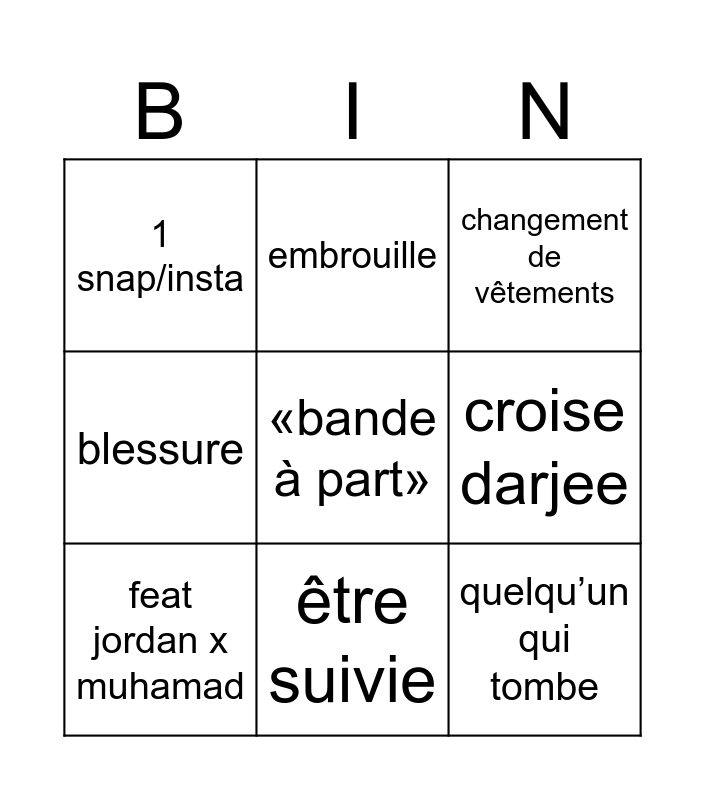 This bingo card has a free space and 8 words: croise darjee, changement de vêtements, embrouille, feat jordan x muhamad, 1 snap/insta, quelqu’un qui tombe, blessure and être suivie.