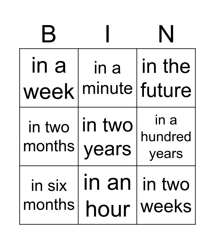 This bingo card has 15 words: in a year, in a month, in the future, in a week, in an hour, in two years, in five years, in ten years, in a hundred years, in two weeks, in six weeks, in two months, in six months, in a minute and in fifty years.