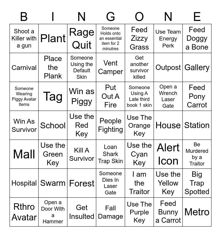 This bingo card has 56 words: Feed Bunny a Carrot, Feed Pony Carrot, Someone Dies In Acid, Shoot a Killer with a gun, School, Forest, Feed Doggy a Bone, Use The Code, Place the Plank, Someone Dies In Laser Gate, Someone Holds onto an essential item for 2 minutres, Hospital, Mall, Station, Open a Door With a Hammer, Use the Green Key, Feed Zizzy Grass, Get another survivor killed, Metro, Outpost, Gallery, Kill A Survivor, Someone Using A Late third book 1 skin, Rage Quit, Free!, Carnival, House, Infection, Someone Using the Default Skin, Loan Shark Trap Skin, Watch a Murder, Be Murdered by a Traitor, Rthro Avatar, Get Insulted, Someone Wearing Piggy Avatar Items, Use Team Energy Perk, Vent Camper, Swarm, Tag, Plant, Put Out A Fire, People Fighting, I am the Traitor, Stepped In A Small Trap, Big Trap Spotted, Win as Piggy, Win As Survivor, Fall Damage, Alert Icon, Use The Orange Key, Use the Red Key, Use the Cyan Key, Use the Yellow Key, Use The Purple Key, Open a Wrench Laser Gate and Player + Bot.