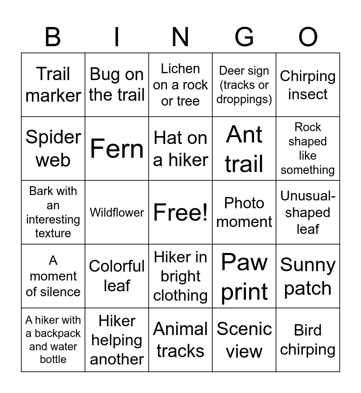 This bingo card has a free space and 50 words: Tree with moss, Bird chirping, Stream or creek, Animal tracks, Colorful leaf, Fallen log, Bug on the trail, Hiking boot print, Spider web, Butterfly, Fern, Deer sign (tracks or droppings), Sunny patch, Paw print, Backpack, Lizard, Hat on a hiker, Photo moment, Mushroom, Chirping insect, Wildflower, Scenic view, Trail marker, Ant trail, Water break, Squirrel, Rock shaped like something, Person with a walking stick, Lichen on a rock or tree, Hiker in bright clothing, Someone taking a photo, Fallen feather, Tree roots across the trail, Bridge or wooden path, Hiker helping another, Flying insect (like a bee or dragonfly), Trail map sign, Birds nest (visible or fallen), Tree stump, Unusual-shaped leaf, Someone drinking water, Something that smells earthy, Listening quietly for sounds, A peaceful spot to sit, A hiker with a backpack and water bottle, Bark with an interesting texture, Two different bird calls, Hugging a tree, A moment of silence and Free.