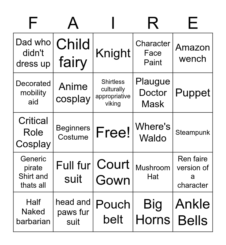This bingo card has a free space and 24 words: Full fur suit, head and paws fur suit, Shirtless culturally appropriative viking, Half Naked barbarian, Amazon wench, Dad who didn't dress up, Decorated mobility aid, Child fairy, Where's Waldo, Court Gown, Plaugue Doctor Mask, Critical Role Cosplay, Mushroom Hat, Ren faire version of a character, Anime cosplay, Big Horns, Steampunk, Knight, Puppet, Beginners Costume, Ankle Bells, Generic pirate Shirt and thats all, Character Face Paint and Pouch belt.