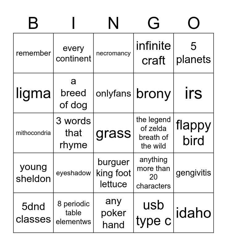 This bingo card has 25 words: eyeshadow, any poker hand, onlyfans, 5dnd classes, 5 planets, remember, ligma, every continent, the legend of zelda breath of the wild, burguer king foot lettuce, brony, mithocondria, anything more than 20 characters, gengivitis, a breed of dog, idaho, flappy bird, necromancy, irs, 3 words that rhyme, grass, 8 periodic table elementws, young sheldon, infinite craft and usb type c.
