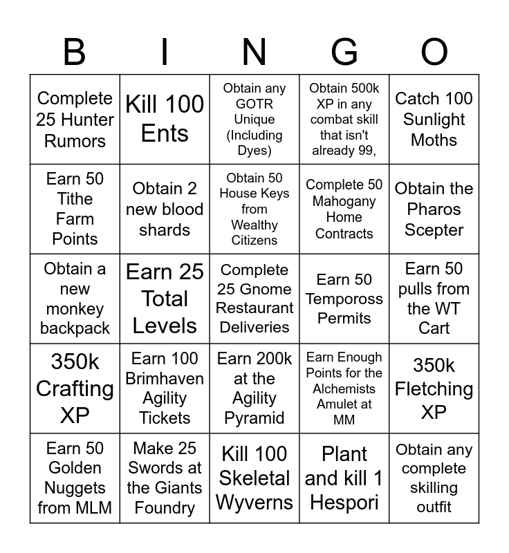 This bingo card has 25 words: Earn 100 Brimhaven Agility Tickets, Kill 100 Skeletal Wyverns, Obtain 50 House Keys from Wealthy Citizens, Earn 50 Golden Nuggets from MLM, Catch 100 Sunlight Moths, Complete 25 Hunter Rumors, Earn 50 Tithe Farm Points, Kill 100 Ents, Earn 50 Tempoross Permits, Earn 200k at the Agility Pyramid, Complete 50 Mahogany Home Contracts, Obtain a new monkey backpack, Earn Enough Points for the Alchemists Amulet at MM, 350k Fletching XP, Obtain 2 new blood shards, Obtain any complete skilling outfit, Earn 50 pulls from the WT Cart, Obtain any GOTR Unique (Including Dyes), Obtain the Pharos Scepter, Earn 25 Total Levels, Complete 25 Gnome Restaurant Deliveries, Make 25 Swords at the Giants Foundry, 350k Crafting XP, Obtain 500k XP in any combat skill that isn't already 99, and Plant and kill 1 Hespori.