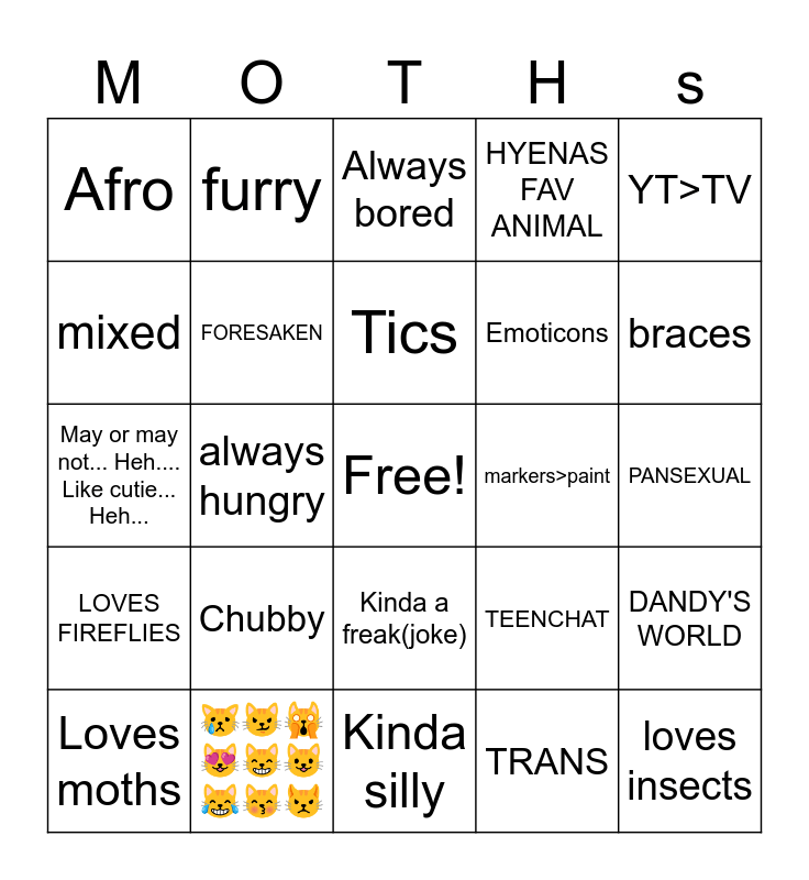 This bingo card has a free space and 24 words: Chubby, πΏπΌππ»πΈπΊπΉπ½πΎ, Tics, Loves moths, YT>TV, Afro, mixed, furry, markers>paint, Kinda a freak(joke), Emoticons, May or may not... Heh.... Like cutie... Heh..., TEENCHAT, DANDY'S WORLD, FORESAKEN, TRANS, PANSEXUAL, Always bored, braces, always hungry, loves insects, LOVES FIREFLIES, HYENAS FAV ANIMAL and Kinda silly.