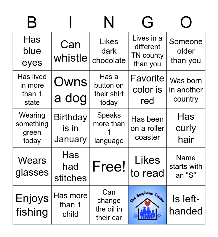 This bingo card has 1 images and 25 words: Free!, Has a button on their shirt today, Has more than 1 child, Someone older than you, Has blue eyes, Has lived in more than 1 state, Can whistle, Has curly hair, Likes to read, Favorite color is red, Wearing something green today, Name starts with an "S", Enjoys fishing, Birthday is in January, Is afraid of spiders, Lives in a different TN county than you, Wears glasses, Likes dark chocolate, Speaks more than 1 language, Was born in another country, Can change the oil in their car, Has been on a roller coaster, Has had stitches, Owns a dog and Is left-handed.
