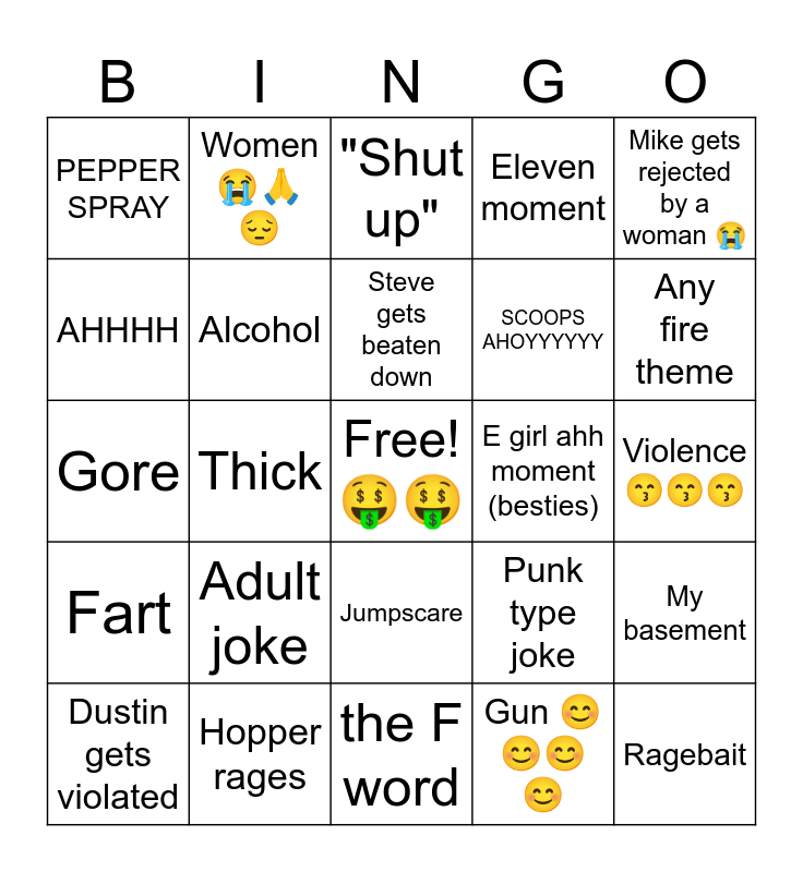 This bingo card has a free space and 24 words: Adult joke, Hopper rages, Steve gets beaten down, Dustin gets violated, Mike gets rejected by a woman 😭, PEPPER SPRAY, AHHHH, Women 😭🙏😔, E girl ahh moment (besties), Jumpscare, SCOOPS AHOYYYYYY, Gore, Punk type joke, My basement, Alcohol, Gun 😊😊😊😊, Violence 😙😙😙, "Shut up", Any fire theme, Thick, Ragebait, Fart, Eleven moment and the F word.