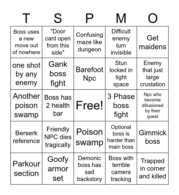 This bingo card has a free space and 24 words: Friendly NPC dies tragically, Goofy armor set, Barefoot Npc, Parkour section, Get maidens, Boss uses a new move out of nowhere, one shot by any enemy, "Door cant open from this side", 3 Phase boss fight, Poison swamp, Stun locked in tight space, Another poison swamp, Optional boss is harder than main boss, Gimmick boss, Gank boss fight, Boss with terrible camera tracking, Npc who become dillusioned by their quest, Confusing maze like dungeon, Enemy that just large crustation, Boss has 2 health bar, Trapped in corner and killed, Berserk reference, Difficult enemy turn invisible and Demonic boss has sad backstory.