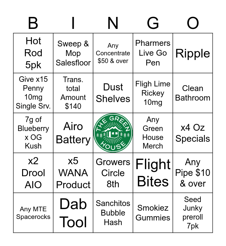 This bingo card has a free space and 24 words: x5 WANA Product, Dab Tool, Dust Shelves, Any MTE Spacerocks, Ripple, Hot Rod 5pk, Give x15 Penny 10mg Single Srv., Sweep & Mop Salesfloor, Any Green House Merch, Growers Circle 8th, Fligh Lime Rickey 10mg, 7g of Blueberry x OG Kush, Flight Bites, Any Pipe $10 & over, Trans. total Amount $140, Smokiez Gummies, x4 Oz Specials, Any Concentrate $50 & over, Clean Bathroom, Airo Battery, Seed Junky preroll 7pk, x2 Drool AIO, Pharmers Live Go Pen and Sanchitos Bubble Hash.