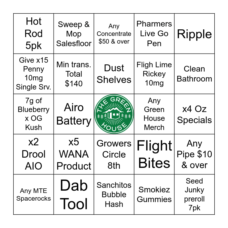 This bingo card has a free space and 24 words: x5 WANA Product, Dab Tool, Dust Shelves, Any MTE Spacerocks, Ripple, Hot Rod 5pk, Give x15 Penny 10mg Single Srv., Sweep & Mop Salesfloor, Any Green House Merch, Growers Circle 8th, Fligh Lime Rickey 10mg, 7g of Blueberry x OG Kush, Flight Bites, Any Pipe $10 & over, Min trans. Total $140, Smokiez Gummies, x4 Oz Specials, Any Concentrate $50 & over, Clean Bathroom, Airo Battery, Seed Junky preroll 7pk, x2 Drool AIO, Pharmers Live Go Pen and Sanchitos Bubble Hash.