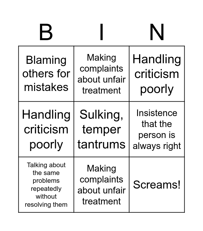 This bingo card has 16 words: Insistence that the person is always right, Disregarding the health and safety of others, Handling criticism poorly, Blaming others for mistakes, Screams!, Making complaints about unfair treatment, Talking about the same problems repeatedly without resolving them, Verbal or written statements of intention to hurt someone, Sulking, temper tantrums, Insistence that the person is always right, Disregarding the health and safety of others, Handling criticism poorly, Blaming others for mistakes, Making complaints about unfair treatment, Talking about the same problems repeatedly without resolving them and And verbalizing hope that something negative will happen against someone with whom they have a grudge.
