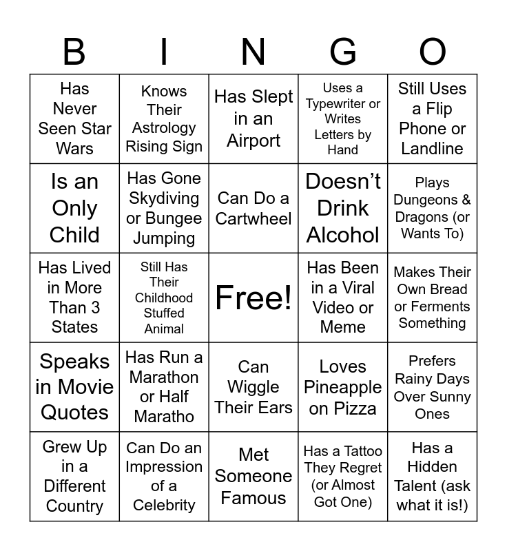 This bingo card has a free space and 25 words: Has Run a Marathon or Half Maratho, Met Someone Famous, Can Do a Cartwheel, Grew Up in a Different Country, Still Uses a Flip Phone or Landline, Has Never Seen Star Wars, Is an Only Child, Knows Their Astrology Rising Sign, Has Been in a Viral Video or Meme, Can Wiggle Their Ears, Doesn’t Drink Alcohol, Has Lived in More Than 3 States, Loves Pineapple on Pizza, Prefers Rainy Days Over Sunny Ones, Has Gone Skydiving or Bungee Jumping, Has a Food Allergy, Makes Their Own Bread or Ferments Something, Has Slept in an Airport, Plays Dungeons & Dragons (or Wants To), Still Has Their Childhood Stuffed Animal, Has a Hidden Talent (ask what it is!), Can Do an Impression of a Celebrity, Speaks in Movie Quotes, Uses a Typewriter or Writes Letters by Hand and Has a Tattoo They Regret (or Almost Got One).