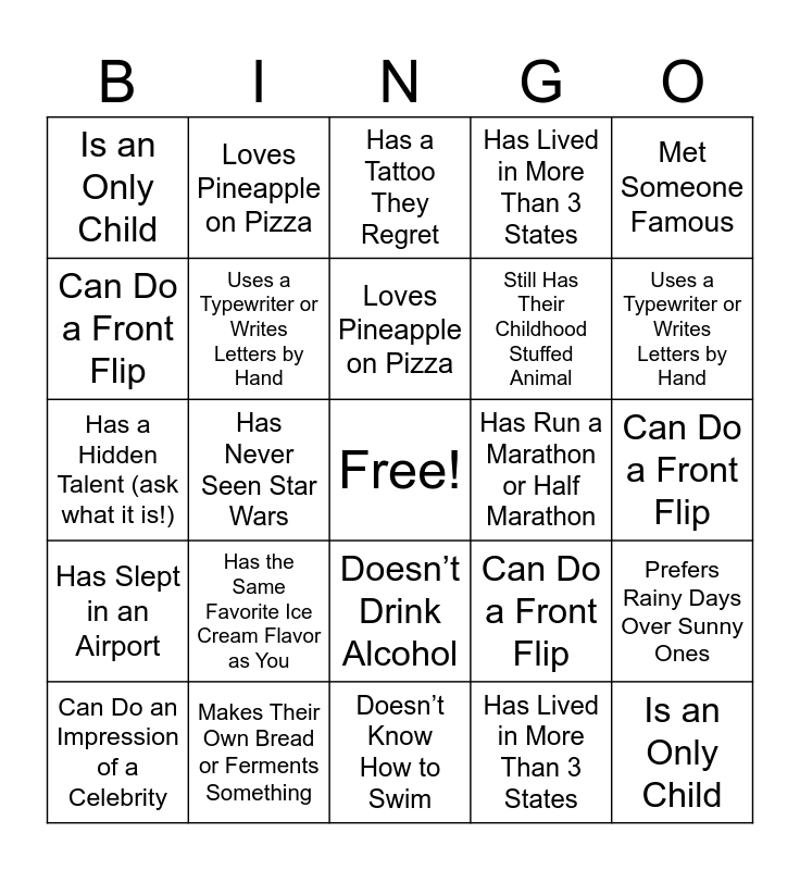 ⚠ This card has duplicate items: Has Run a Marathon or Half Marathon (4), Met Someone Famous (4), Can Do a Front Flip (4), Grew Up in a Different Country (4), Still Uses a Flip Phone or Landline (4), Has Never Seen Star Wars (4), Is an Only Child (4), Can Wiggle Their Ears (4), Doesn’t Drink Alcohol (4), Has Lived in More Than 3 States (4), Loves Pineapple on Pizza (4), Prefers Rainy Days Over Sunny Ones (4), Has Gone Skydiving or Bungee Jumping (4), Makes Their Own Bread or Ferments Something (4), Has Slept in an Airport (4), Plays Dungeons & Dragons (4), Still Has Their Childhood Stuffed Animal (4), Has a Hidden Talent (ask what it is!) (4), Can Do an Impression of a Celebrity (4), Uses a Typewriter or Writes Letters by Hand (4), Has a Tattoo They Regret (4), Has the Same Favorite Ice Cream Flavor as You (4), Was in a School Play (4), Has Had a Paranormal Experience (4), Doesn’t Know How to Swim (4)