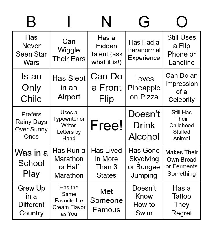 This bingo card has a free space and 25 words: Has Run a Marathon or Half Marathon, Met Someone Famous, Can Do a Front Flip, Grew Up in a Different Country, Still Uses a Flip Phone or Landline, Has Never Seen Star Wars, Is an Only Child, Can Wiggle Their Ears, Doesn’t Drink Alcohol, Has Lived in More Than 3 States, Loves Pineapple on Pizza, Prefers Rainy Days Over Sunny Ones, Has Gone Skydiving or Bungee Jumping, Makes Their Own Bread or Ferments Something, Has Slept in an Airport, Plays Dungeons & Dragons, Still Has Their Childhood Stuffed Animal, Has a Hidden Talent (ask what it is!), Can Do an Impression of a Celebrity, Uses a Typewriter or Writes Letters by Hand, Has a Tattoo They Regret, Has the Same Favorite Ice Cream Flavor as You, Was in a School Play, Has Had a Paranormal Experience and Doesn’t Know How to Swim.