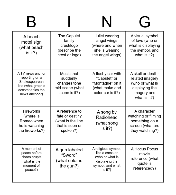 This bingo card has 21 words: A gun labeled “Sword” (what color is the gun?), A letter being delivered or undelivered (who is the letter addressed to?), The Capulet family crest/logo (describe the crest or logo), A scene with water (who is in the scene?), A religious symbol, like a cross or (who or what is displaying the symbol, and what is it?), A flashy car with “Capulet” or “Montague” on it (what make and color car is it?), A beach motel sign (what beach is it?), Juliet wearing angel wings (where and when she is wearing the angel wings), A song by Radiohead (what song is it?), A skull or death-related imagery (who or what is displaying the imagery and what is it?), Fireworks (where is Romeo when he is watching the fireworks?), A visual symbol of love (who or what is displaying the symbol, and what is it?), A Hocus Pocus movie reference (what quote is referenced?), A choir singing during a dramatic moment (what are they singing?), Music that suddenly changes tone mid-scene (what scene is it?), A moment showing the clash of love vs. violence (what is happening in this moment?), A moment of peace before chaos erupts (what is the moment of peace?), A reference to fate or destiny (what is the line that is seen or spoken?), A TV news anchor reporting on a Shakespearean line (what graphic accompanies the news anchor?), A character watching or filming something on a screen (what are they watching?) and A Bible or book with Shakespearean text inside (what does the text say?).