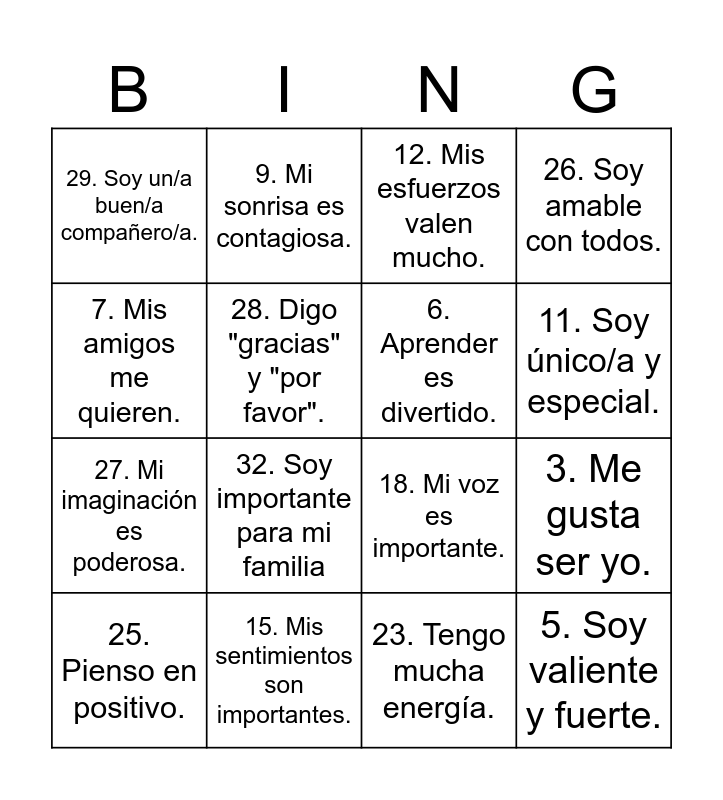 This bingo card has 32 words: 1. Soy un niño/a increíble., 2. Mis ideas son geniales., 3. Me gusta ser yo., 4. Puedo lograr lo que me propongo., 5. Soy valiente y fuerte., 6. Aprender es divertido., 7. Mis amigos me quieren., 8. Soy un/a gran ayudante., 9. Mi sonrisa es contagiosa., 10. Intento cosas nuevas., 11. Soy único/a y especial., 12. Mis esfuerzos valen mucho., 13. Puedo pedir ayuda., 14. Soy inteligente y creativo/a., 15. Mis sentimientos son importantes., 16. ¡Soy capaz!, 17. Me quiero como soy., 18. Mi voz es importante., 19. Siempre puedo mejorar., 20. Hago mi mejor esfuerzo., 21. Compartir me hace feliz., 22. Soy bueno/a escuchando., 23. Tengo mucha energía., 24. Resuelvo problemas., 25. Pienso en positivo., 26. Soy amable con todos., 27. Mi imaginación es poderosa., 28. Digo "gracias" y "por favor"., 29. Soy un/a buen/a compañero/a., 30. Puedo aprender de mis errores., 31. Me divierto al jugar. and 32. Soy importante para mi familia.