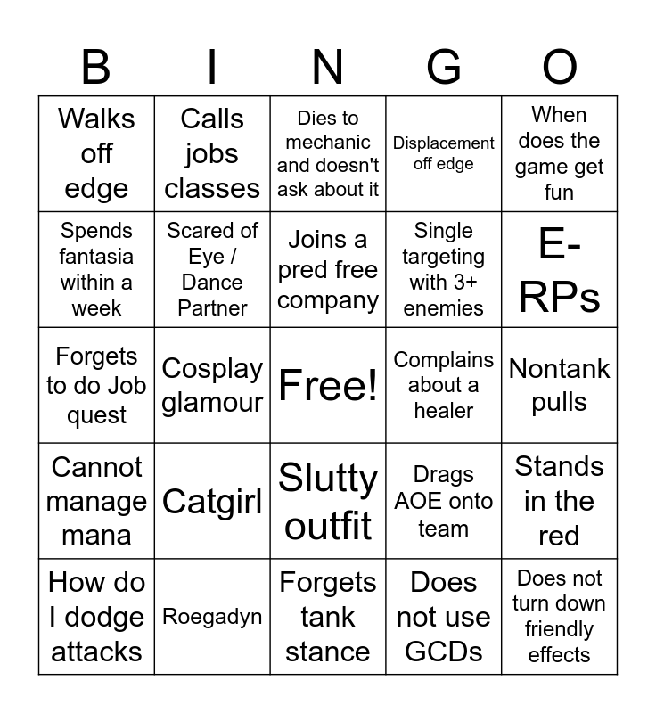 This bingo card has a free space and 24 words: Catgirl, Roegadyn, Joins a pred free company, How do I dodge attacks, When does the game get fun, Walks off edge, Spends fantasia within a week, Calls jobs classes, Complains about a healer, Slutty outfit, Single targeting with 3+ enemies, Forgets to do Job quest, Drags AOE onto team, Stands in the red, Scared of Eye / Dance Partner, Does not use GCDs, Nontank pulls, Dies to mechanic and doesn't ask about it, E-RPs, Cosplay glamour, Does not turn down friendly effects, Cannot manage mana, Displacement off edge and Forgets tank stance.
