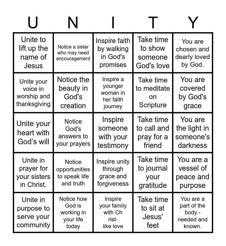 This bingo card has 25 words: Unite in prayer for your sisters in Christ., Notice how God is working in your life today, Inspire someone with your testimony, Take time to sit at Jesus' feet, You are chosen and dearly loved by God., Unite to lift up the name of Jesus, Notice a sister who may need encouragement, Inspire faith by walking in God's promises, Take time to call and pray for a friend, You are a vessel of peace and purpose, Unite your voice in worship and thanksgiving, Notice the beauty in God's creation, Inspire your family with Christ-like love, Take time to journal your gratitude, You are covered by God's grace, Unite in purpose to serve your community, Notice God's answers to your prayers, Inspire a younger woman in her faith journey, Take time to meditate on Scripture, You are the light in someone's darkness, Unite your heart with God’s will, Notice opportunities to speak life and truth, Inspire unity through grace and forgiveness, Take time to show someone God's love and You are a part of the body - needed and known..