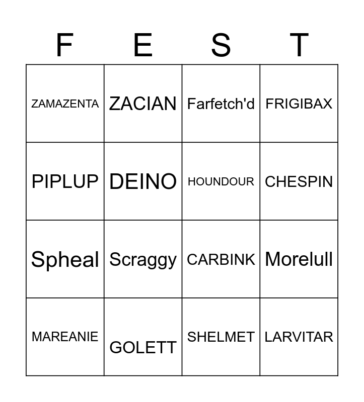 This bingo card has 16 words: GOLETT, Morelull, Farfetch'd, ZAMAZENTA, Spheal, ZACIAN, CARBINK, SHELMET, PIPLUP, DEINO, MAREANIE, FRIGIBAX, Scraggy, CHESPIN, HOUNDOUR and LARVITAR.