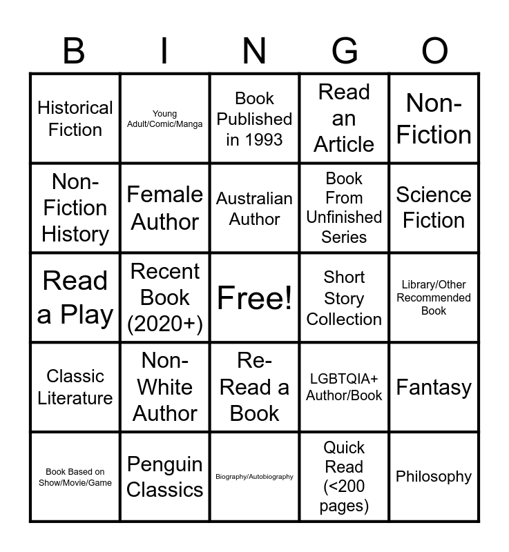 This bingo card has a free space and 24 words: Non-White Author, Penguin Classics, Australian Author, Book Based on Show/Movie/Game, Non-Fiction, Historical Fiction, Non-Fiction History, Young Adult/Comic/Manga, Short Story Collection, Re-Read a Book, Book From Unfinished Series, Read a Play, LGBTQIA+ Author/Book, Fantasy, Female Author, Quick Read (<200 pages), Library/Other Recommended Book, Book Published in 1993, Science Fiction, Recent Book (2020+), Philosophy, Classic Literature, Read an Article and Biography/Autobiography.