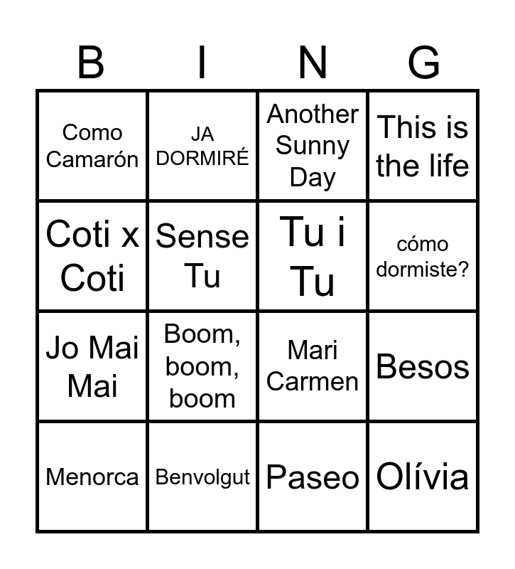 This bingo card has 1 images and 81 words: S'ha mort l'home més vell d'Espolla, Another Sunny Day, SALVAJE, DIABLA, Blue tack, Vint-i-pocs, Septiembre, Eso Que Tú Me Das, Nunca Estoy, To My Love, Males Cares, Tu i Tu, Benvolgut, Tenía Tanto Que Darte, Como Camarón, si quieres, Sense Tu, Cap. 2: Havia de Passar, Marta, Sebas, Guille y los demás, Carolina, Jo Mai Mai, Menorca, Coti x Coti, Besos, Física o química, Tobogan, QUE NO S'ACABI, La primavera trompetera, 20 de abril, LA PLATJA, Mediterrània, Mari Carmen, El Tren Huracán, Mussegu, Escriurem, Una lluna a l'aigua, Summercat, Boom, boom, boom, L'escut al pit, SexeSexy, This is the life, 3MMC, Felixità, Gorg, JA DORMIRÉ, Fondo de bikini, cómo dormiste?, Pa amb oli i sal, Quan caminàvem, Boig per tu, Paseo, Jenifer, SOLUCIONS i NO PROBLEMES, Amics, tiets i coneguts, Wannabe, Baby One More Time, Vull estar amb tu, Bailoteo, L'empordà, Torno a ser jo, Es Gratis, Olívia, Zapatillas, Llença't, Jean Luc, Princesas, A la sombra de la sierra, Gat Rumberu, Bon Dia, Camals Mullats, Cuando sale el sol, Voy a celebrarlo, LLepolies, Fullar sempre, Hamaking, Pastillas para dormir, The bright side, La Tabarra, Fil de llum, Llençols and Alosque.