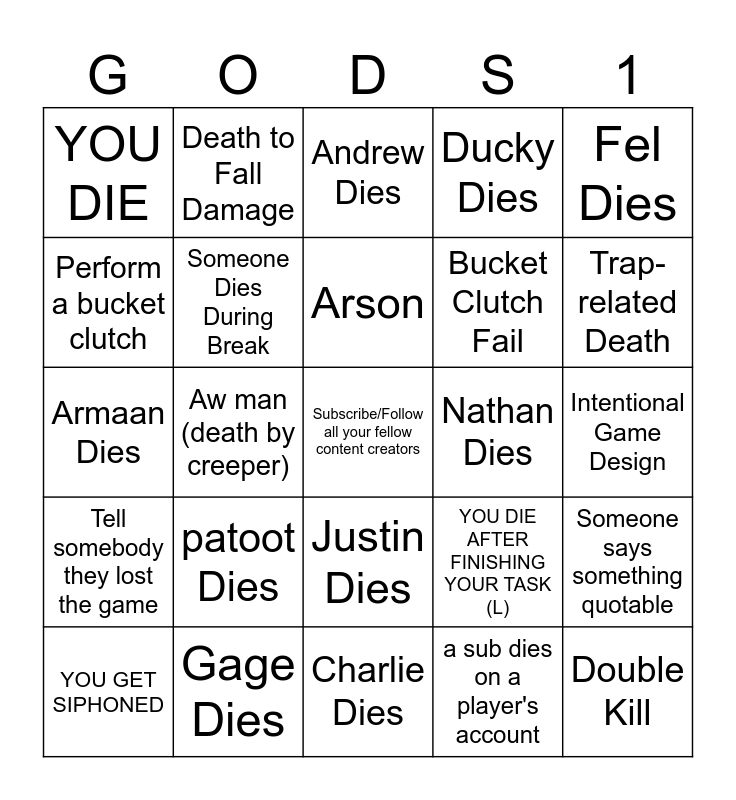 This bingo card has a free space and 45 words: A Player Drowns, Double Kill, Stupid Death, YOU GET SIPHONED, Player is unseen for a whole session, a sub dies on a player's account, Andrew Dies, awa Dies, Fel Dies, Gage Dies, Ducky Dies, Nathan Dies, Justin Dies, patoot Dies, Emma Dies, Charlie Dies, Palmer Dies, Armaan Dies, Forgot to turn in quest, Trap-related Death, Death to Fall Damage, A Player is Eliminated, Technical Difficulties, YOU DIE, PVP Death, Intentional Game Design, COMPLETE YOUR TASK BEFORE THE FIRST SIPHON, Betrayal, YOU DIE AFTER FINISHING YOUR TASK (L), Tell somebody they lost the game, Make a trade, Someone says something quotable, Someone dies in the first 30 minutes, Base Destruction, Drama, Aw man (death by creeper), A player obtains a netherite item, Endermen Death, Become Red, Arson, Perform a bucket clutch, Bucket Clutch Fail, Make a clip, Someone Dies During Break and Break is longer than 10 minutes.