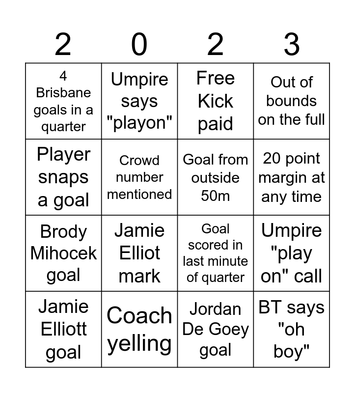 This bingo card has 31 words: Free!, Deliberate out of bounds, Umpire "play on" call, 4 Collingwood goals in a quarter, 4 Brisbane goals in a quarter, Free Kick paid, Goal from outside 50m, Player kicks 2nd goal, Coach yelling, Celebrity spotted, Jordan De Goey goal, Jamie Elliott goal, Brownlow mentioned, 50m penalty, Jamie Elliot mark, Scores level (not 0-0), Kick hits post, Nick Daicos 25 disposals, BT says "oh boy", Goal scored in first minute of quarter, Player snaps a goal, Goal missed within 25m, Score Review, Umpire says "playon", Brody Mihocek goal, Crowd number mentioned, Out of bounds on the full, Goal scored in last minute of quarter, 6 goal quarter, 20 point margin at any time and Deliberate out of bounds.