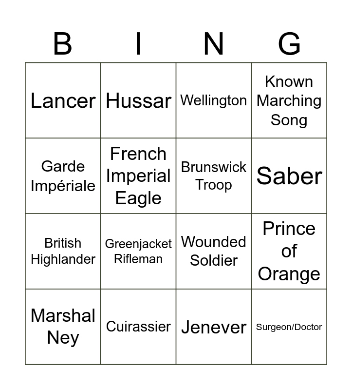 This bingo card has 20 words: Prince of Orange, Blücher, Wellington, Napoleon, Marshal Ney, Garde Impériale, Cuirassier, Lancer, British Highlander, Hussar, Greenjacket Rifleman, Wounded Soldier, French Imperial Eagle, Surgeon/Doctor, Brunswick Troop, Infantry Square, Saber, Known Marching Song, Jenever and Female Camp Follower.