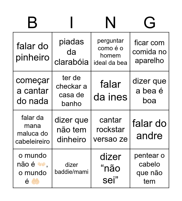 This bingo card has 29 words: falar da ex, falar das entradas, falar do andre, falar do pedro, falar do pinheiro, perguntar como é o homem ideal da bea, falar da ines, falar do pé, dizer baddie/mami, hiperbolizar uma conversa antiga, dizer “não sei”, o mundo não é 👐🏻, o mundo é 🤲🏻, falar dos ex da bea aka eu, dizer “oh mano”, dizer que não tem dinheiro, dizer que conseguia bater no gonçalo, rir com a mão a frente da boca, pentear o cabelo que não tem, começar a cantar do nada, cantar rockstar versao ze, falar de gajas em geral, falar da joana J, falar da mana maluca do cabeleireiro, ter de checkar a casa de banho, ficar com comida no aparelho, piadas da clarabóia, falar do tiago, dizer que a bea é boa and dizer que a filipa é gorda.