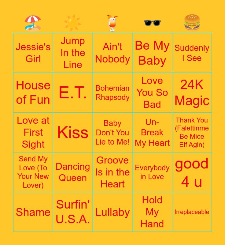 This bingo card has 85 words: Hand in My Pocket, Gangsta's Paradise, Ain't Nobody, Messy, Mamma Mia, Xanadu, How Will I Know, Crush, Take Your Mama, Don't Stop Me Now, The One That Got Away, Freedom, E.T., Un-Break My Heart, Bette Davis Eyes, Jessie's Girl, Shame, House of Fun, I'm in the Mood for Dancing, You're Still The One, Itsy Bitsy Teeny Weeny Yellow Polka Dot Bikini, Love You So Bad, Baby Don't You Lie to Me!, Techno Fan, Kiss, Reach, Wrecking Ball, Pump It, The Tide is High, Torn, Dancing Queen, Drops of Jupiter (Tell Me), I Don't Feel Like Dancin', Love at First Sight, Irreplaceable, Don't You (Forget About Me), Lullaby, Love Never Felt So Good, Send My Love (To Your New Lover), 24K Magic, Creepin Up The Backstairs, jar of hearts, Get Up Offa That Thing, Tragedy, Junk Of The Heart (Happy), Someday, Kill The Director, Last Request, Paradise, Five Colours In Her Hair, Jump In the Line, Bohemian Rhapsody, Hungry Eyes, Summer Nights, Free Fallin', Ain't No Mountain High Enough, Surfin' U.S.A., Be My Baby, Bamboléo, Party In The U.S.A., Hey, Soul Sister, Never Gonna Not Dance Again, Only Girl (In The World), Dancing in the Moonlight, Dance The Night, Suddenly I See, When I Kissed The Teacher, good 4 u, I Don't Care, Teenage Dream, Pink Pony Club, Crazy In Love, Viva La Vida, Island In The Sun, American Boy, Groove Is in the Heart, Hold My Hand, Holiday, Forget Me, Ocean Man, Thank You (Falettinme Be Mice Elf Agin), It's Raining Men, Mama Do (Uh Oh, Uh Oh), Everybody in Love and Heart Skips a Beat.