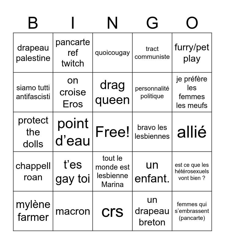 This bingo card has a free space and 24 words: t’es gay toi, macron, drag queen, mylène farmer, furry/pet play, drapeau palestine, siamo tutti antifascisti, pancarte ref twitch, bravo les lesbiennes, tout le monde est lesbienne Marina, personnalité politique, protect the dolls, un enfant., est ce que les hétérosexuels vont bien ?, on croise Eros, un drapeau breton, allié, quoicougay, je préfère les femmes les meufs, point d’eau, femmes qui s’embrassent (pancarte), chappell roan, tract communiste and crs.