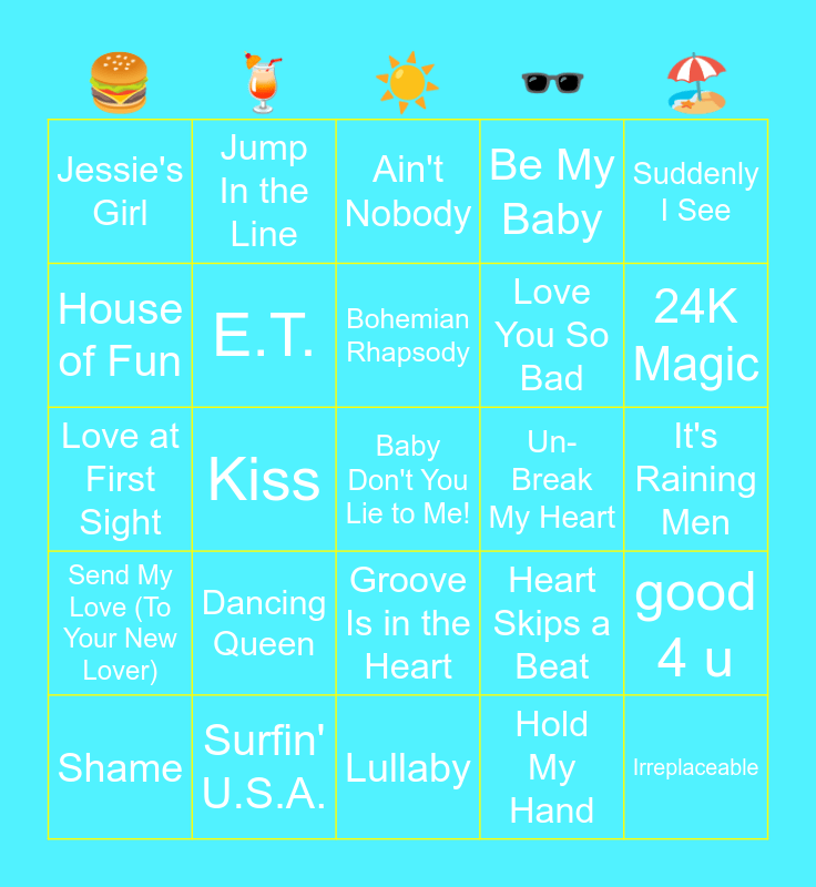 This bingo card has 85 words: Hand in My Pocket, Gangsta's Paradise, Ain't Nobody, Messy, Mamma Mia, Xanadu, How Will I Know, Crush, Take Your Mama, Don't Stop Me Now, The One That Got Away, Freedom, E.T., Un-Break My Heart, Bette Davis Eyes, Jessie's Girl, Shame, House of Fun, I'm in the Mood for Dancing, Your Still The One, Itsy Bitsy Teeny Weeny Yellow Polka Dot Bikini, Love You So Bad, Baby Don't You Lie to Me!, Techno Fan, Kiss, Reach, Wrecking Ball, Pump It, The Tide Is High, Torn, Dancing Queen, Drops of Jupiter (Tell Me), I Don't Feel Like Dancin', Love at First Sight, Irreplaceable, Don't You (Forget About Me), Lullaby, Love Never Felt So Good, Send My Love (To Your New Lover), 24K Magic, Creepin Up The Backstairs, jar of hearts, Get Up Offa That Thing, Tragedy, Junk Of The Heart (Happy), Someday, Kill the Director, Last Request, Paradise, Five Colours In Her Hair, Jump In the Line, Bohemian Rhapsody, Hungry Eyes, Summer Nights, Free Fallin', Ain't No Mountain High Enough, Surfin' U.S.A., Be My Baby, Bamboléo, Party In The U.S.A., Hey, Soul Sister, Never Gonna Not Dance Again, Only Girl (In The World), Dancing in the Moonlight, Dance The Night, Suddenly I See, When I Kissed The Teacher, good 4 u, I Don't Care, Teenage Dream, Pink Pony Club, Crazy In Love, Viva La Vida, Island In The Sun, American Boy, Groove Is in the Heart, Hold My Hand, Forget Me, Ocean Man, Thank You (Falettinme Be Mice Elf Agin), It's Raining Men, Mama Do (Uh Oh, Uh Oh), Everybody in Love, Heart Skips a Beat and Take Me Out.