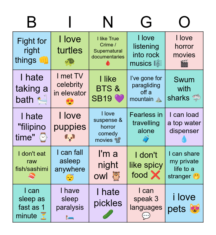 This bingo card has 25 words: I can fall asleep anywhere 😴, I hate pickles 🥒, I like BTS & SB19 💜, I can sleep as fast as 1 minute ⏳, I love horror movies 🎬, Fight for right things 👊, I hate taking a bath 🛀, I love turtles 🐢, Fearless in travelling alone 🧳, I'm a night owl 🦉, I’ve gone for paragliding off a mountain ⛰️, I hate "filipino time" ⌚, I don't like spicy food ❌, I can share my private life to a stranger 🤭, I met TV celebrity in elevator 😍, i love pets 😻, I can load a top water dispenser 💧, I like True Crime / Supernatural documentaries 🩸, Swum with sharks 🦈, I love puppies 🐶, I love suspense & horror comedy movies 📽️, I have sleep paralysis 🛏️, I don't eat raw fish/sashimi 🍣, I love listening into rock musics 🎼 and I can speak 3 languages 💬.