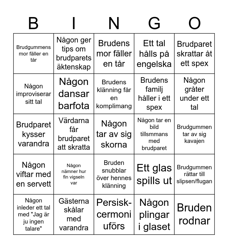 This bingo card has a free space and 24 words: Någon nämner hur fin vigseln var, Gästerna skålar med varandra, Brudens klänning får en komplimang, Någon inleder ett tal med "Jag är ju ingen talare", Brudparet skrattar åt ett spex, Brudgummens mor fäller en tår, Någon improviserar sitt tal, Någon ger tips om brudparets äktenskap, Någon tar en bild tillsmmans med brudparet, Bruden snubblar över hennes klänning, Brudens familj håller i ett spex, Brudparet kysser varandra, Ett glas spills ut, Brudgummen rättar till slipsen/flugan, Någon dansar barfota, Någon plingar i glaset, Brudgummen tar av sig kavajen, Brudens mor fäller en tår, Någon gråter under ett tal, Värdarna får brudparet att skratta, Bruden rodnar, Någon viftar med en servett, Ett tal hålls på engelska and Persisk-cermoni uförs.