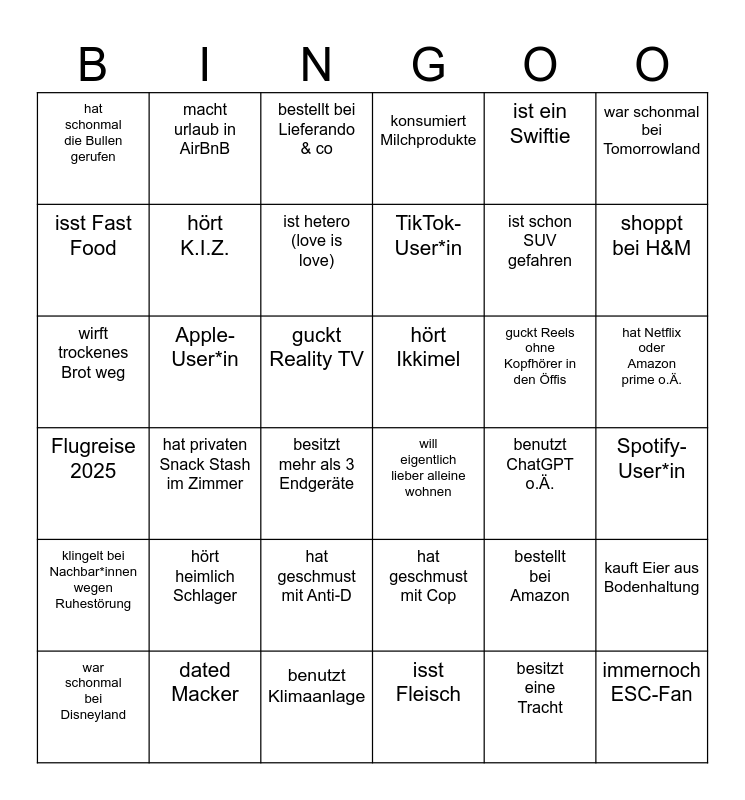 This bingo card has 36 words: hat geschmust mit Cop, hat geschmust mit Anti-D, isst Fleisch, isst Fast Food, Flugreise 2025, hört Ikkimel, hört K.I.Z., benutzt Klimaanlage, ist ein Swiftie, bestellt bei Amazon, shoppt bei H&M, konsumiert Milchprodukte, kauft Eier aus Bodenhaltung, Apple-User*in, TikTok-User*in, hat schonmal die Bullen gerufen, klingelt bei Nachbar*innen wegen Ruhestörung, guckt Reels ohne Kopfhörer in den Öffis, wirft trockenes Brot weg, bestellt bei Lieferando & co, guckt Reality TV, hat privaten Snack Stash im Zimmer, will eigentlich lieber alleine wohnen, besitzt mehr als 3 Endgeräte, benutzt ChatGPT o.Ä., macht urlaub in AirBnB, ist schon SUV gefahren, dated Macker, ist hetero (love is love), war schonmal bei Tomorrowland, immernoch ESC-Fan, war schonmal bei Disneyland, Spotify-User*in, hat Netflix oder Amazon prime o.Ä., hört heimlich Schlager and besitzt eine Tracht.
