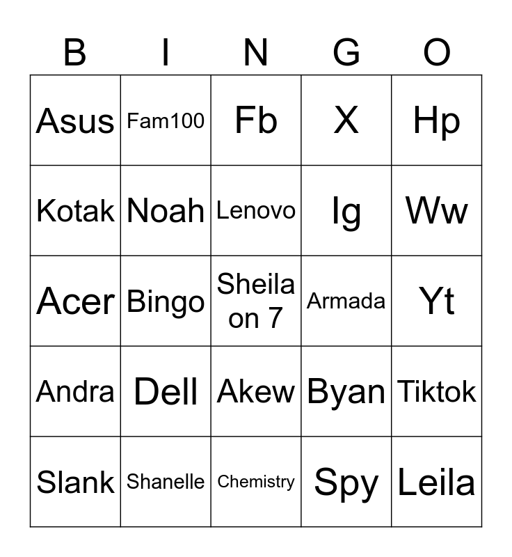 This bingo card has a free space and 24 words: Dell, Shanelle, Lenovo, Slank, Hp, Asus, Kotak, Fam100, Armada, Akew, Ig, Acer, Byan, Tiktok, Noah, Spy, Yt, Fb, Ww, Bingo, Leila, Andra, X and Chemistry.