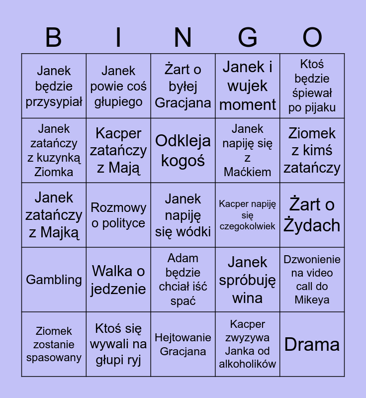 This bingo card has a free space and 24 words: Walka o jedzenie, Ktoś się wywali na głupi ryj, Odkleja kogoś, Ziomek zostanie spasowany, Ktoś będzie śpiewał po pijaku, Janek będzie przysypiał, Janek zatańczy z kuzynką Ziomka, Janek powie coś głupiego, Kacper napiję się czegokolwiek, Adam będzie chciał iść spać, Janek napiję się z Maćkiem, Janek zatańczy z Majką, Janek spróbuję wina, Dzwonienie na video call do Mikeya, Kacper zatańczy z Mają, Kacper zwyzywa Janka od alkoholików, Żart o Żydach, Żart o byłej Gracjana, Ziomek z kimś zatańczy, Rozmowy o polityce, Drama, Gambling, Janek i wujek moment and Hejtowanie Gracjana.