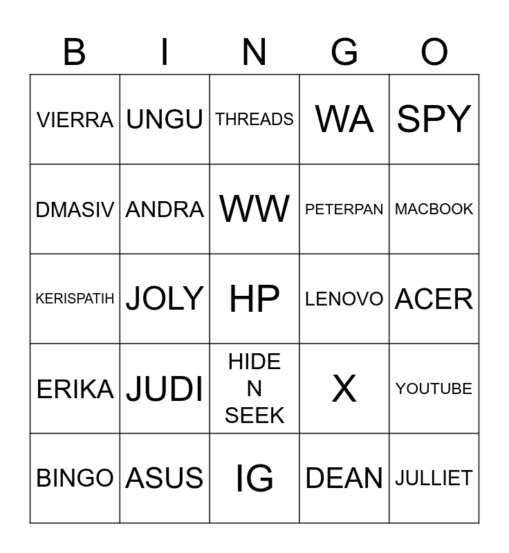This bingo card has a free space and 24 words: JUDI, ASUS, WW, BINGO, SPY, VIERRA, DMASIV, UNGU, LENOVO, HIDE N SEEK, PETERPAN, KERISPATIH, X, YOUTUBE, ANDRA, DEAN, ACER, THREADS, MACBOOK, JOLY, JULLIET, ERIKA, WA and IG.