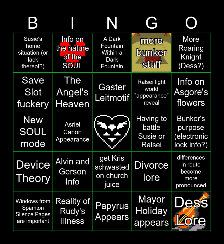 This bingo card has 3 images, a free space and 24 words: Windows from Spamton Silence Pages are important, Alvin and Gerson Info, Gaster Leitmotif, Mayor Holiday appears, More Roaring Knight (Dess?), Susie's home situation (or lack thereof?), Info on the nature of the SOUL, A Dark Fountain Within a Dark Fountain, Having to battle Susie or Ralsei, Bunker's purpose (electronic lock info?), New SOUL mode, The Angel's Heaven, Divorce lore, differences in route become more pronounced, Save Slot fuckery, Reality of Rudy's Illness, Papyrus Appears, more bunker stuff, Info on Asgore's flowers, Device Theory, Asriel Canon Appearance, get Kris schwasted on church juice, Ralsei light world "appearance" reveal and Dess Lore.
