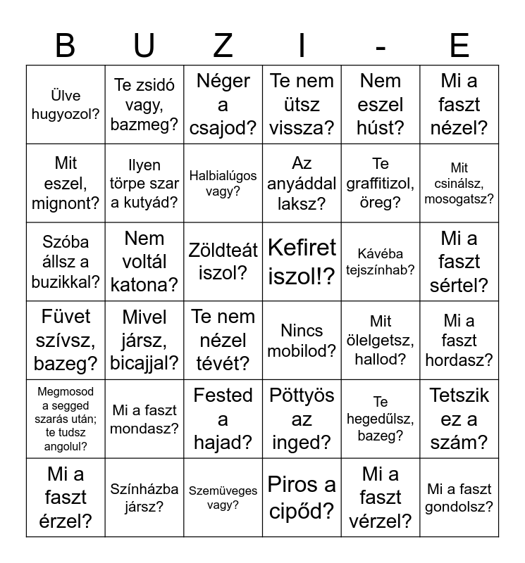 This bingo card has 36 words: Pöttyös az inged?, Fested a hajad?, Piros a cipőd?, Mit eszel, mignont?, Füvet szívsz, bazeg?, Kefiret iszol!?, Ilyen törpe szar a kutyád?, Szemüveges vagy?, Nem eszel húst?, Te hegedűlsz, bazeg?, Mit csinálsz, mosogatsz?, Te nem ütsz vissza?, Tetszik ez a szám?, Nem voltál katona?, Az anyáddal laksz?, Ülve hugyozol?, Megmosod a segged szarás után; te tudsz angolul?, Kávéba tejszínhab?, Szóba állsz a buzikkal?, Néger a csajod?, Zöldteát iszol?, Mivel jársz, bicajjal?, Nincs mobilod?, Te nem nézel tévét?, Mit ölelgetsz, hallod?, Te zsidó vagy, bazmeg?, Te graffitizol, öreg?, Színházba jársz?, Halbialúgos vagy?, Mi a faszt nézel?, Mi a faszt gondolsz?, Mi a faszt érzel?, Mi a faszt hordasz?, Mi a faszt sértel?, Mi a faszt mondasz? and Mi a faszt vérzel?.