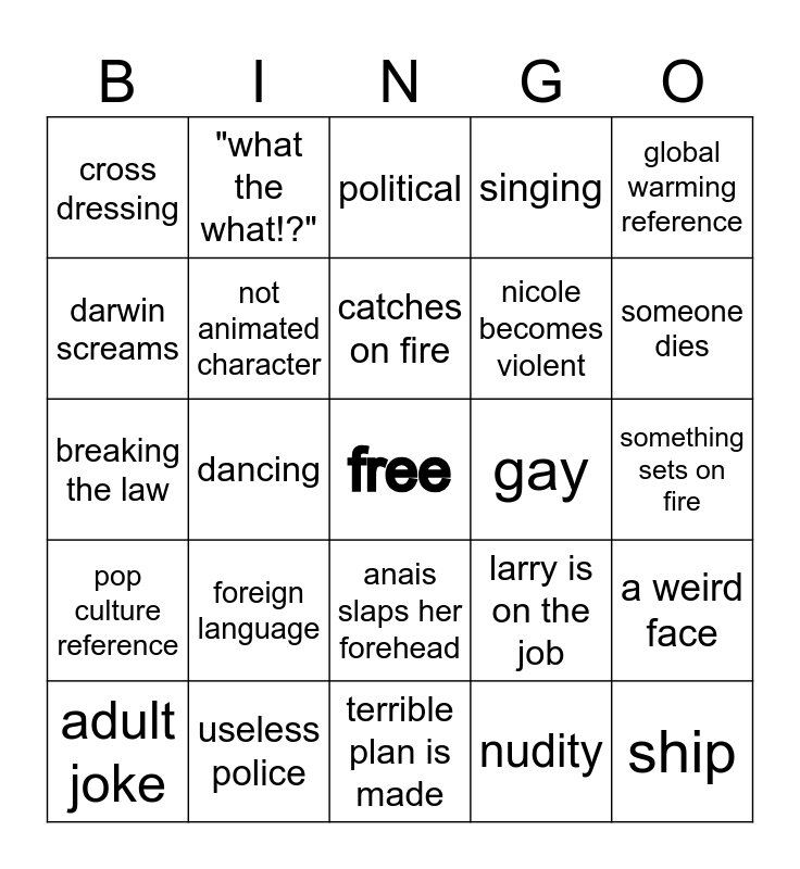 This bingo card has a free space and 24 words: foreign language, useless police, catches on fire, adult joke, global warming reference, cross dressing, darwin screams, "what the what!?", gay, anais slaps her forehead, nicole becomes violent, breaking the law, larry is on the job, a weird face, not animated character, nudity, something sets on fire, political, someone dies, dancing, ship, pop culture reference, singing and terrible plan is made.