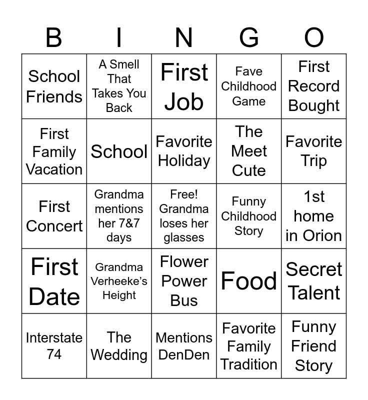 This bingo card has a free space and 29 words: Interstate 74, Flowers, Grandma mentions her 7&7 days, Grapevines, School Friends, First Job, School, Grandma Verheeke’s Height, Funny Childhood Story, The Wedding, 1st home in Orion, Funny Friend Story, Mentions DenDen, Favorite Family Tradition, Favorite Trip, School Activities, Flower Power Bus, First Date, First Record Bought, First Concert, Food, Fashion in your 20’s, The Meet Cute, First Family Vacation, Fave Childhood Game, A Smell That Takes You Back, Secret Talent, Favorite Holiday and Ever Been Lost.