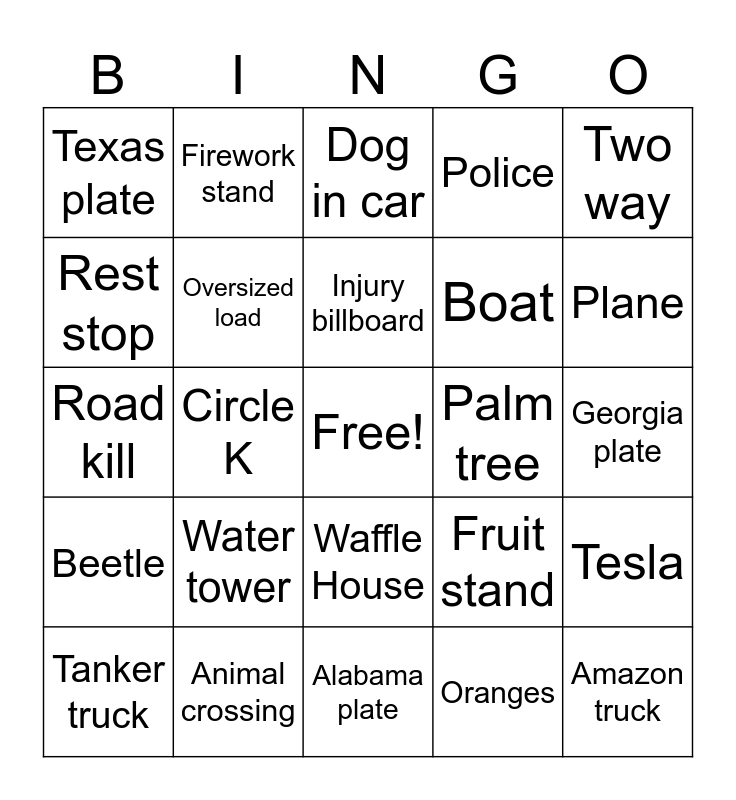 This bingo card has a free space and 34 words: Jesus sign, Oranges, Casino sign, Wrong way, Beetle, Oversized load, Two way, Tanker truck, Firework stand, College, Injury billboard, Dog in car, American flag, Ocean, Palm tree, Plane, Animal crossing, Road kill, Water tower, Fruit stand, Waffle House, Broken down car, Texas plate, Georgia plate, Alabama plate, Amazon truck, Police, Car twins!!, Boat, Rest stop, Car dealership, Circle K, Tesla and Motorcycle.