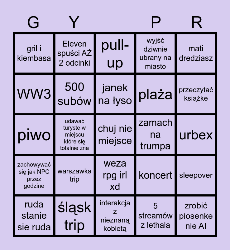 This bingo card has a free space and 24 words: warszawka trip, śląsk trip, janek na łyso, ruda stanie sie ruda, mati dredziasz, gril i kiembasa, WW3, Eleven spuści AŻ 2 odcinki, zamach na trumpa, weza rpg irl xd, plaża, piwo, koncert, sleepover, 500 subów, 5 streamów z lethala, urbex, pull-up, przeczytać książke, udawać turyste w miejscu które się totalnie zna, zrobić piosenke nie AI, zachowywać się jak NPC przez godzine, wyjść dziwnie ubrany na miasto and interakcja z nieznaną kobietą.