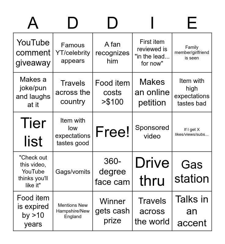 This bingo card has a free space and 24 words: Gags/vomits, Mentions New Hampshire/New England, Food item costs >$100, Food item is expired by >10 years, Family member/girlfriend is seen, YouTube comment giveaway, Makes a joke/pun and laughs at it, Famous YT/celebrity appears, Sponsored video, 360-degree face cam, Makes an online petition, Tier list, Drive thru, Gas station, Travels across the country, Travels across the world, If I get X likes/views/subs..., A fan recognizes him, Item with high expectations tastes bad, Item with low expectations tastes good, Talks in an accent, "Check out this video, YouTube thinks you'll like it", First item reviewed is "in the lead... for now" and Winner gets cash prize.