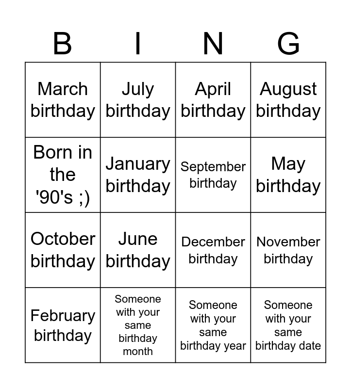 This bingo card has 16 words: Someone with your same birthday month, November birthday, April birthday, March birthday, October birthday, July birthday, December birthday, Someone with your same birthday year, Born in the '90's ;), January birthday, February birthday, August birthday, June birthday, May birthday, September birthday and Someone with your same birthday date.