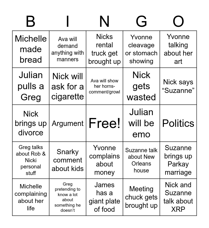 This bingo card has a free space and 24 words: Snarky comment about kids, Greg pretending to know a lot about something he doesn’t, Ava will show her horns- comment/growl, Michelle complaining about her life, Yvonne talking about her art, Michelle made bread, Julian pulls a Greg, Ava will demand anything with manners, Julian will be emo, Yvonne complains about money, Nick gets wasted, Nick brings up divorce, Suzanne talk about New Orleans house, Suzanne brings up Parkay marriage, Nick will ask for a cigarette, Meeting chuck gets brought up, Politics, Nicks rental truck get brought up, Nick says “Suzanne”, Argument, Nick and Suzanne talk about XRP, Greg talks about Rob & Nicki personal stuff, Yvonne cleavage or stomach showing and James has a giant plate of food.